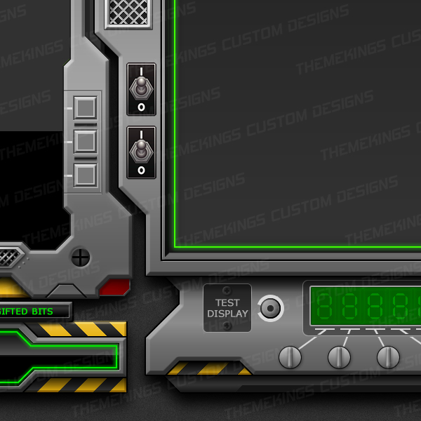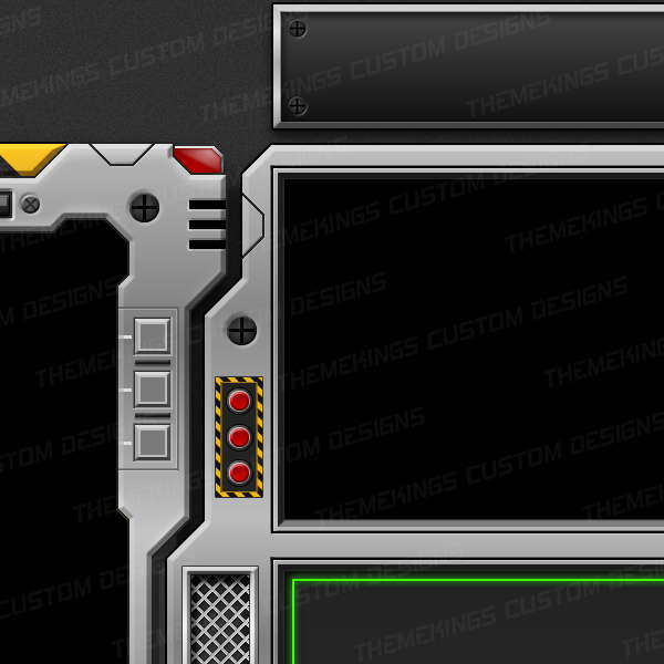 • Main Video Window: Framed by rugged silver-gray metal with yellow/black caution stripes on the top and bottom rails, perfect for showcasing your gameplay or primary content.