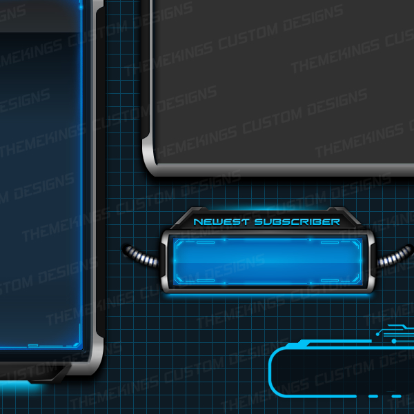- Alert Modules: Three bottom pods labeled “Newest Subscriber,” “Newest Follower,” and “Newest Donation,” each framed in polished steel and connected by animated conduit tubing.